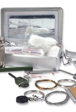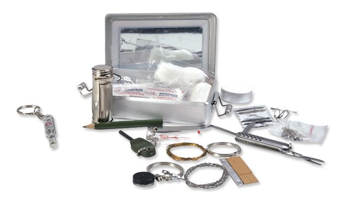 Inhoud: mes, noodfluitje, draadzaag, draad, visset, watten, kaars, potlood, zelfklevende reparatiefolie, Minikompas, naaisetje, veiligheidsspelden, vuurstarter, spiegel, scheermesje, zout, afzonderlijk verpakte pleisters, gipsrol, waterdichte noodcapsule